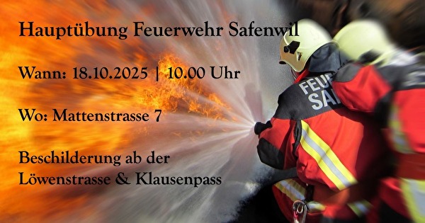 Die Bevölkerung von Safenwil ist herzlich eingeladen der Hauptübung beizuwohnen. Flyer im Anhang. Beschilderung ab Löwenstrasse & Klausenpass